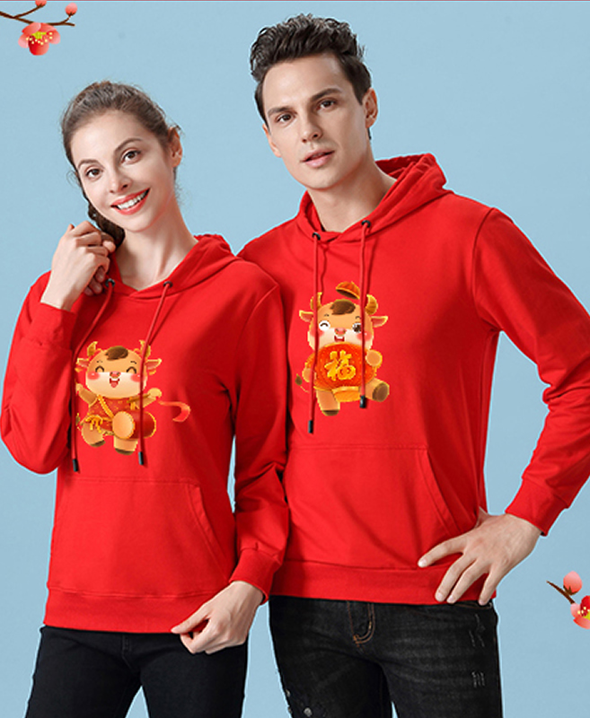 • YDWY201212男女同款2021生肖牛年加絨連帽新年紅色衛(wèi)衣定制本命年元旦公司年會印logo
